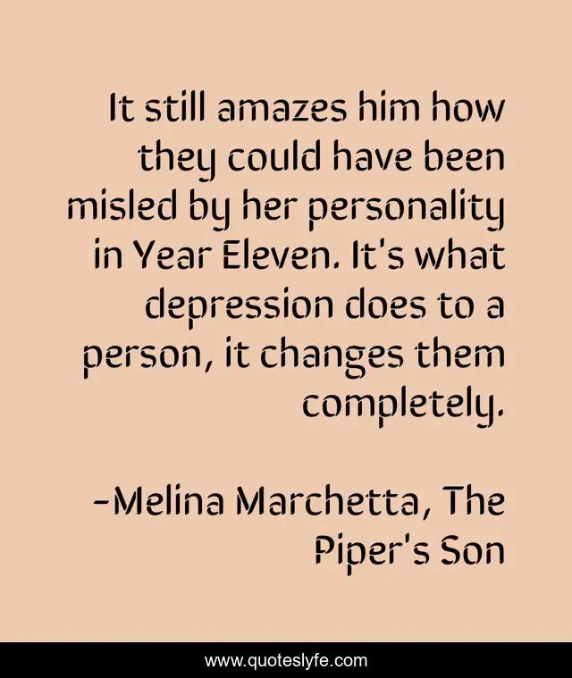 This page presents the quote "It still amazes him how they could have been misled by her personality in Year Eleven. It's what depression does to a person, it changes them completely.". Author of this quote is Melina Marchetta, The Piper's Son. .