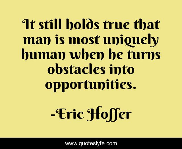 This page presents the quote "It still holds true that man is most uniquely human when he turns obstacles into opportunities.". Author of this quote is Eric Hoffer. This quote is about motivation, obstacles, opportunity,.