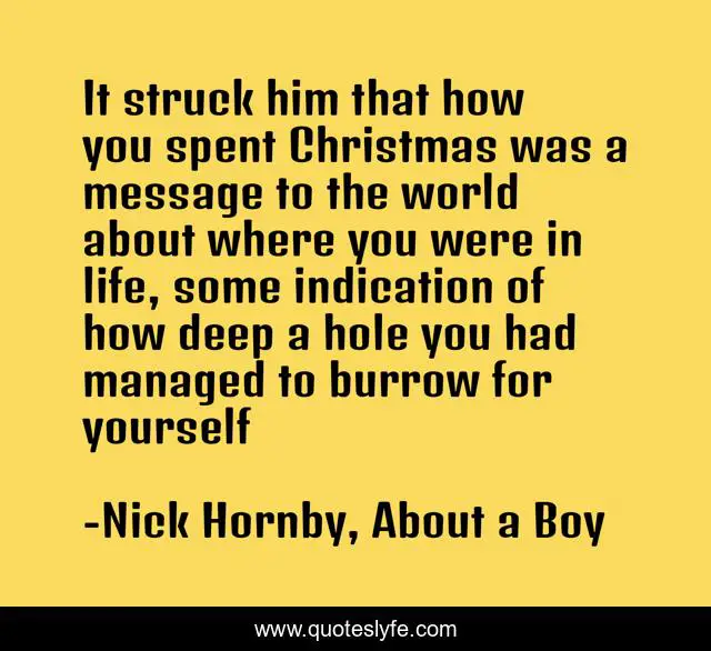 This page presents the quote "It struck him that how you spent Christmas was a message to the world about where you were in life, some indication of how deep a hole you had managed to burrow for yourself". Author of this quote is Nick Hornby, About a Boy. This quote is about christmas, humour,.