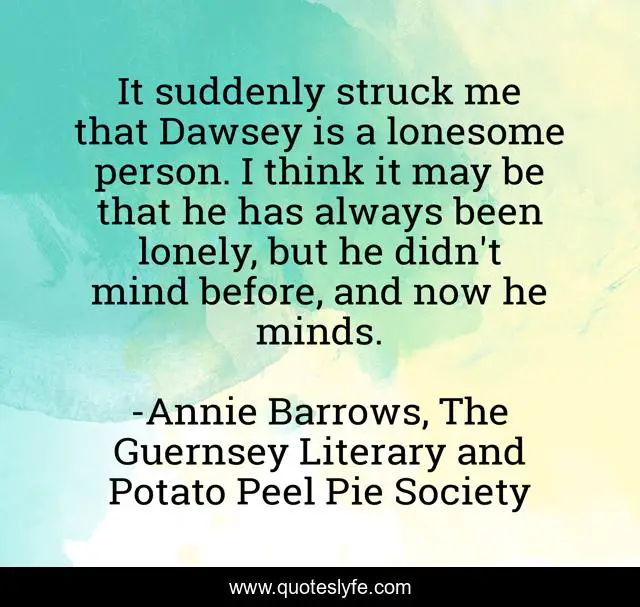 This page presents the quote "It suddenly struck me that Dawsey is a lonesome person. I think it may be that he has always been lonely, but he didn't mind before, and now he minds.". Author of this quote is Annie Barrows, The Guernsey Literary and Potato Peel Pie Society. This quote is about relationships, longing, loneliness,.