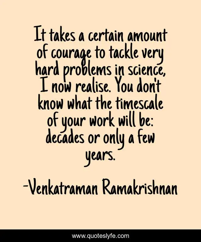 This page presents the quote "It takes a certain amount of courage to tackle very hard problems in science, I now realise. You don't know what the timescale of your work will be: decades or only a few years.". Author of this quote is Venkatraman Ramakrishnan. This quote is about science, work, problems,.