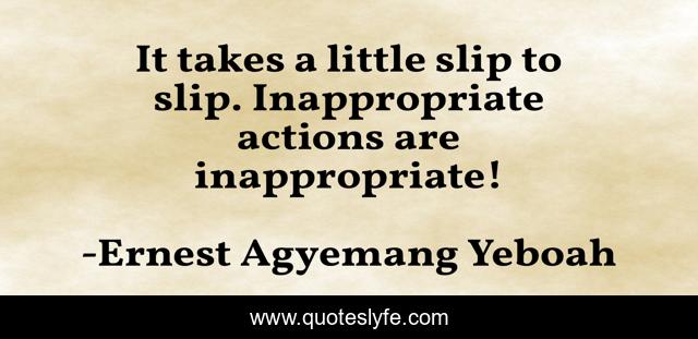 This page presents the quote "It takes a little slip to slip. Inappropriate actions are inappropriate!". Author of this quote is Ernest Agyemang Yeboah. This quote is about actions, behaviour, attitude, reflections, self-assessment, wrong-actions,.