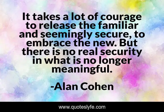This page presents the quote "It takes a lot of courage to release the familiar and seemingly secure, to embrace the new. But there is no real security in what is no longer meaningful.". Author of this quote is Alan Cohen. This quote is about meaning, courage, change,.