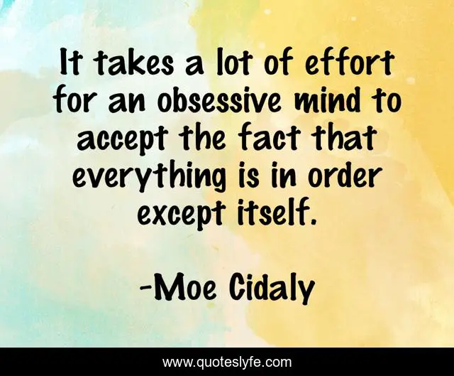 This page presents the quote "It takes a lot of effort for an obsessive mind to accept the fact that everything is in order except itself.". Author of this quote is Moe Cidaly. This quote is about effort, acceptance, mind, obsession, order, fact,.