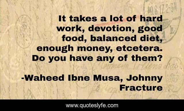 This page presents the quote "It takes a lot of hard work, devotion, good food, balanced diet, enough money, etcetera. Do you have any of them?". Author of this quote is Waheed Ibne Musa, Johnny Fracture. This quote is about pursuit, fighting-spirit,.