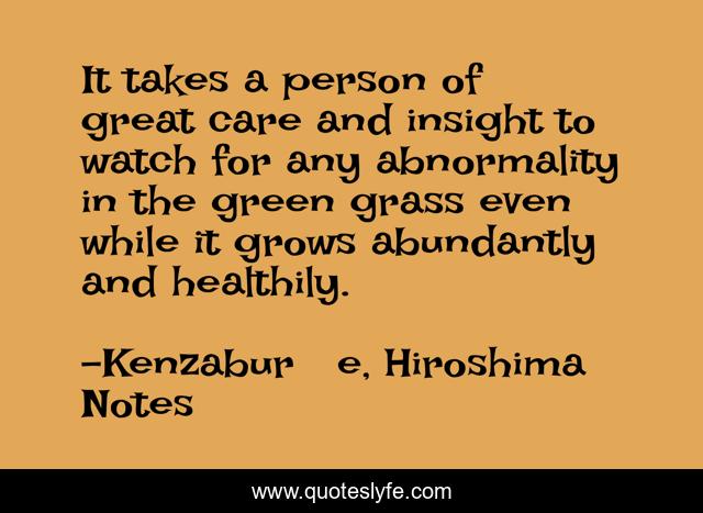 This page presents the quote "It takes a person of great care and insight to watch for any abnormality in the green grass even while it grows abundantly and healthily.". Author of this quote is Kenzaburō Ōe, Hiroshima Notes. .