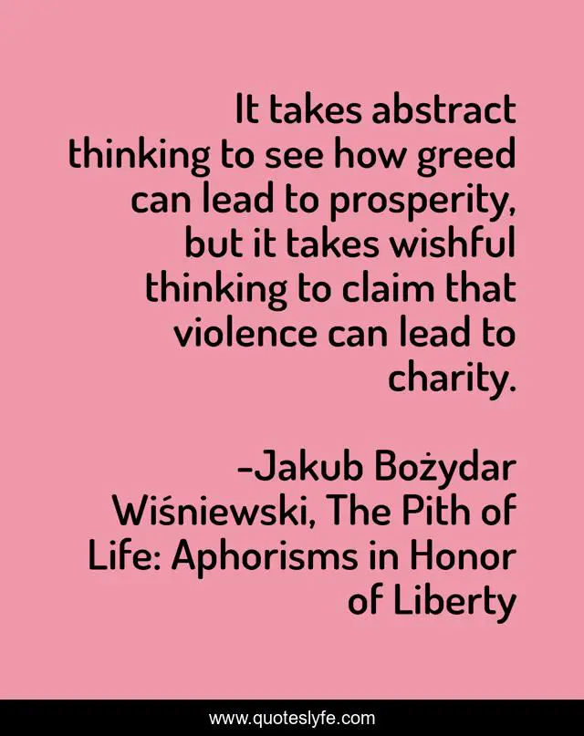 This page presents the quote "It takes abstract thinking to see how greed can lead to prosperity, but it takes wishful thinking to claim that violence can lead to charity.". Author of this quote is Jakub Bożydar Wiśniewski, The Pith of Life: Aphorisms in Honor of Liberty. This quote is about prosperity, violence, greed, charity,.