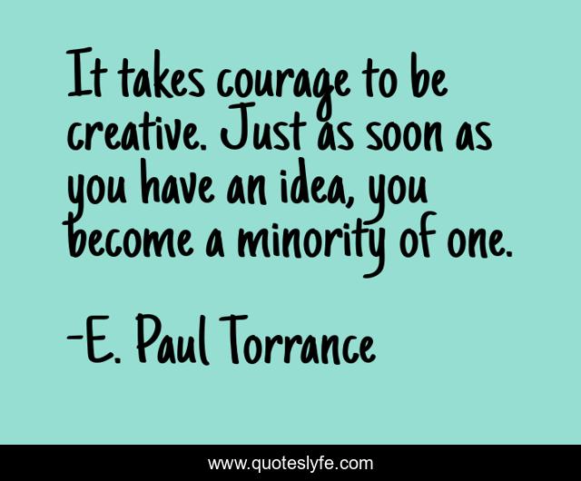 This page presents the quote "It takes courage to be creative. Just as soon as you have an idea, you become a minority of one.". Author of this quote is E. Paul Torrance. This quote is about loneliness, creativity, ideas,.