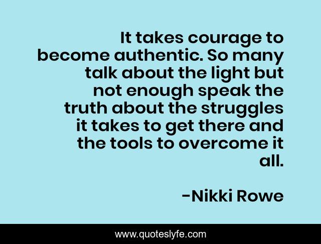This page presents the quote "It takes courage to become authentic. So many talk about the light but not enough speak the truth about the struggles it takes to get there and the tools to overcome it all.". Author of this quote is Nikki Rowe. This quote is about real, master-self, inspire, mindfulness, freedom, wounds-to-wisdom, zen, self-help-inspirational, awakening,.
