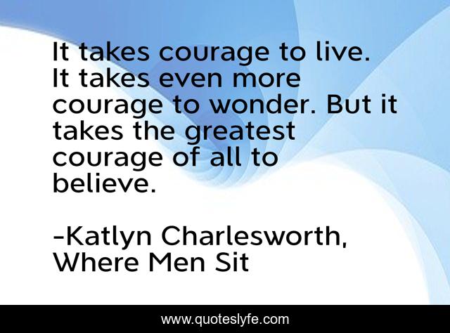 This page presents the quote "It takes courage to live. It takes even more courage to wonder. But it takes the greatest courage of all to believe.". Author of this quote is Katlyn Charlesworth, Where Men Sit. This quote is about live, courage, inspirational, enthusiasm, believe, wonder,.
