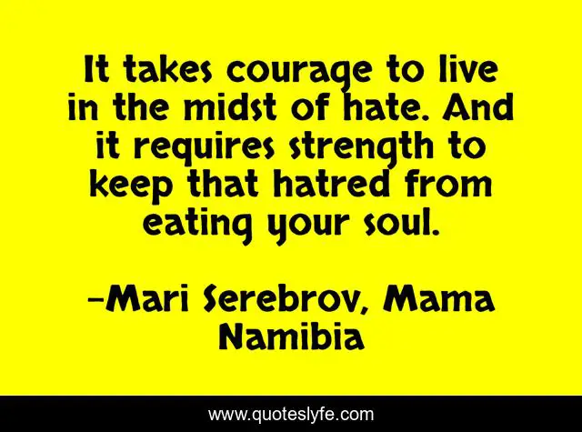 This page presents the quote "It takes courage to live in the midst of hate. And it requires strength to keep that hatred from eating your soul.". Author of this quote is Mari Serebrov, Mama Namibia. This quote is about hatred, life-lessons,.