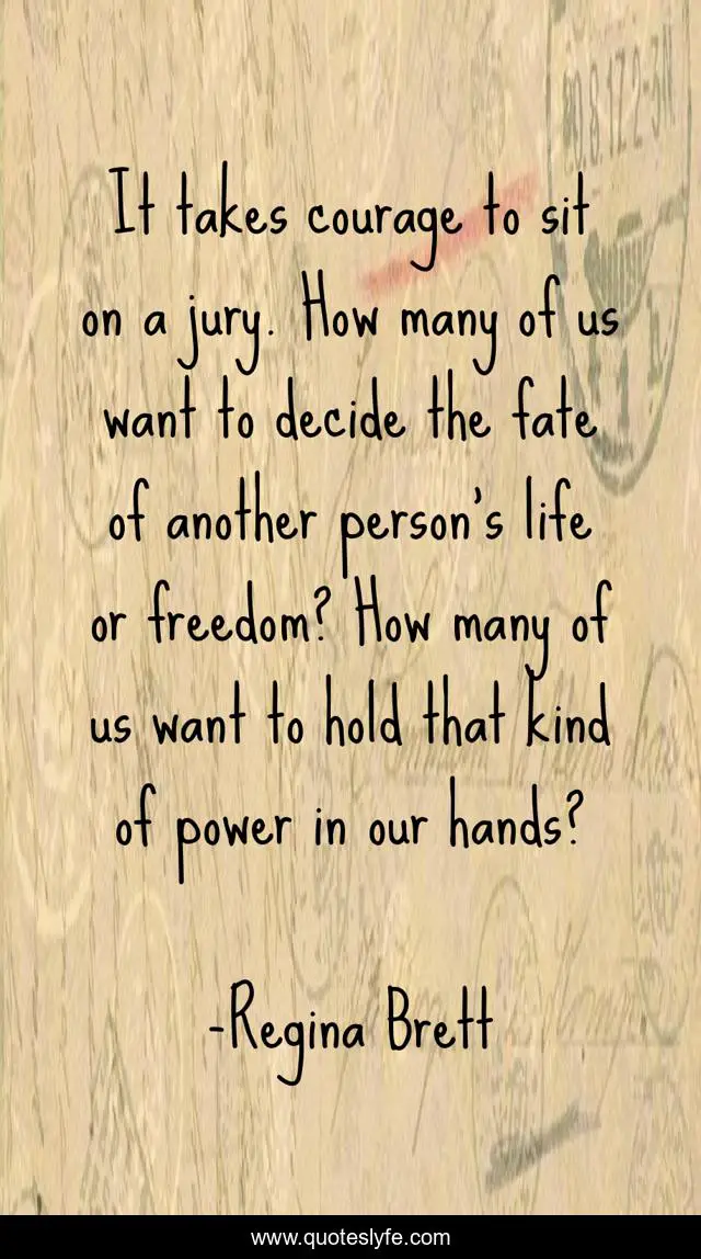 This page presents the quote "It takes courage to sit on a jury. How many of us want to decide the fate of another person's life or freedom? How many of us want to hold that kind of power in our hands?". Author of this quote is Regina Brett. This quote is about freedom, life, power,.