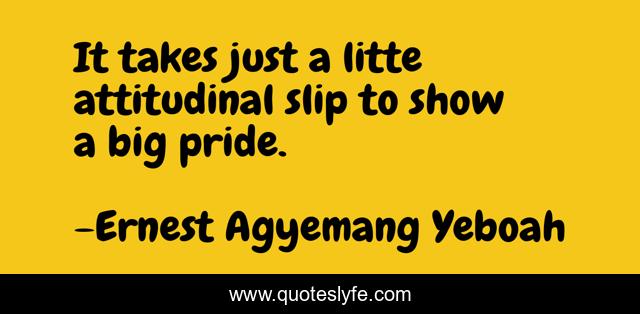 This page presents the quote "It takes just a litte attitudinal slip to show a big pride.". Author of this quote is Ernest Agyemang Yeboah. This quote is about humility-and-purpose, humility-in-greatness, behaviour, attitude, arrogance-and-attitude, pride,.