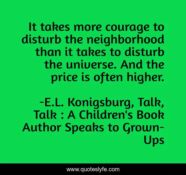 This page presents the quote "It takes more courage to disturb the neighborhood than it takes to disturb the universe. And the price is often higher.". Author of this quote is E.L. Konigsburg, Talk, Talk : A Children's Book Author Speaks to Grown-Ups. This quote is about revolution, art, science, creativity, ideas, courage, books, change,.