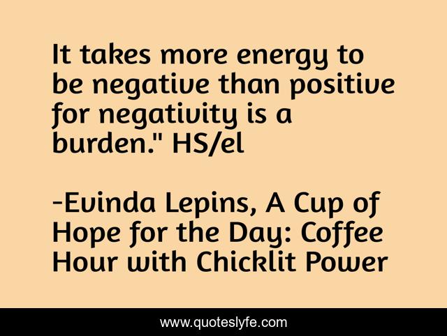 This page presents the quote "It takes more energy to be negative than positive for negativity is a burden." HS/el". Author of this quote is Evinda Lepins, A Cup of Hope for the Day: Coffee Hour with Chicklit Power. This quote is about positive, confidence, negative, burden,.