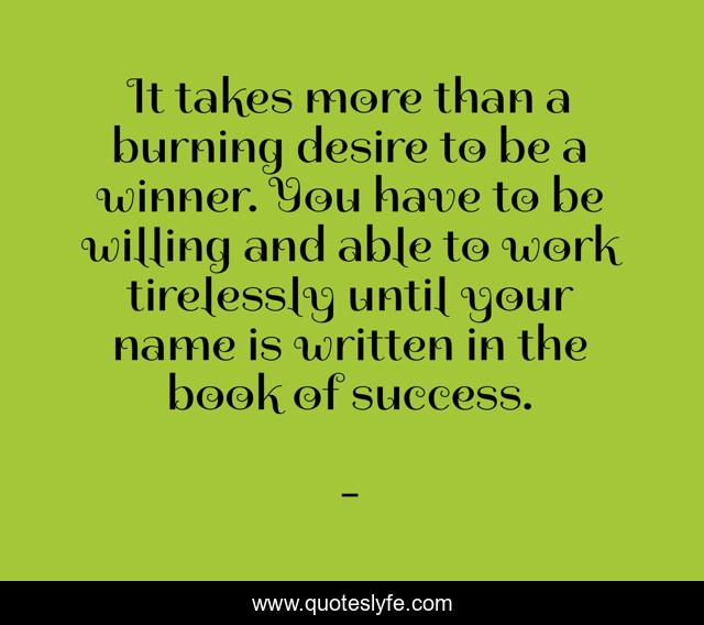 This page presents the quote "It takes more than a burning desire to be a winner. You have to be willing and able to work tirelessly until your name is written in the book of success.". Author of this quote is . This quote is about edmond-mbiaka, the-book-of-success, having-a-burning-desire, the-desire-to-be-a-winner,.
