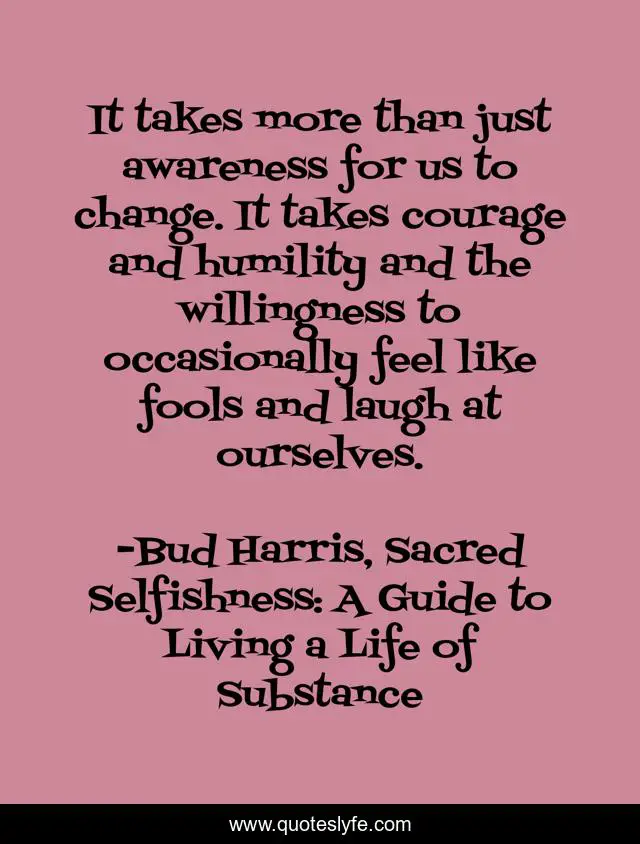 This page presents the quote "It takes more than just awareness for us to change. It takes courage and humility and the willingness to occasionally feel like fools and laugh at ourselves.". Author of this quote is Bud Harris, Sacred Selfishness: A Guide to Living a Life of Substance. This quote is about courage-change-self-reflection, fools, laugh-at-yourself, awareness, humility,.