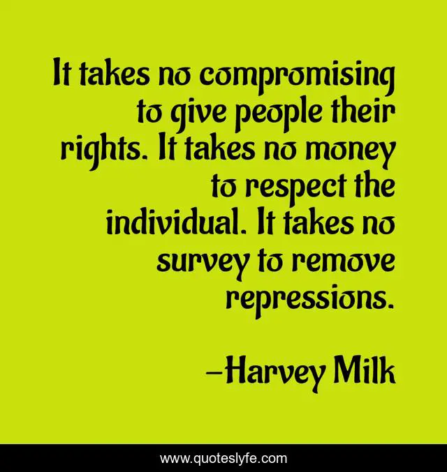 "Harvey Milk Quotes." Quoteslyfe.com, 2025. Mon. 08 Dec. 2025. <https://www.quoteslyfe.com/quote/It-takes-no-compromising-to-give-people-283459>.