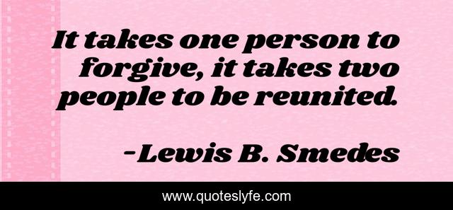 This page presents the quote "It takes one person to forgive, it takes two people to be reunited.". Author of this quote is Lewis B. Smedes. This quote is about person, forgive, people,.