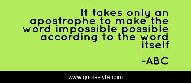 This page presents the quote "It takes only an apostrophe to make the word impossible possible according to the word itself". Author of this quote is ABC. This quote is about confidence, positive, motivational, i-mpossible, encouragement, optimistic, inspirational, enthusiasm,.