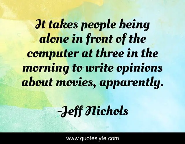 This page presents the quote "It takes people being alone in front of the computer at three in the morning to write opinions about movies, apparently.". Author of this quote is Jeff Nichols. This quote is about alone, being alone, people,.