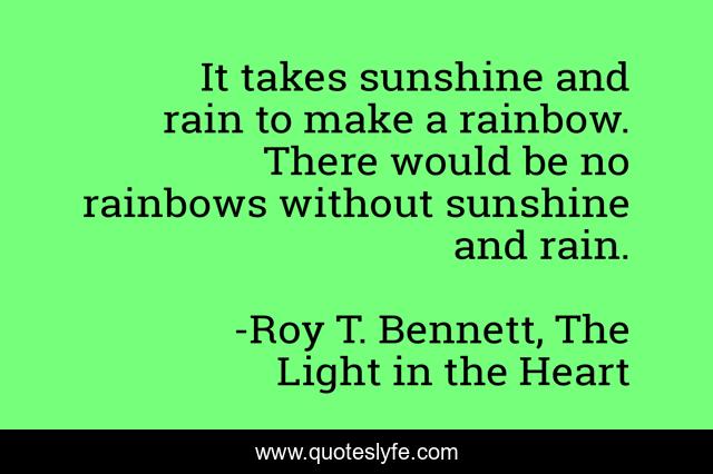 This page presents the quote "It takes sunshine and rain to make a rainbow. There would be no rainbows without sunshine and rain.". Author of this quote is Roy T. Bennett, The Light in the Heart. This quote is about motivation, inspire, rainbows, optimistic, inspirational-life, life-and-living, living, inspiring, positive,.