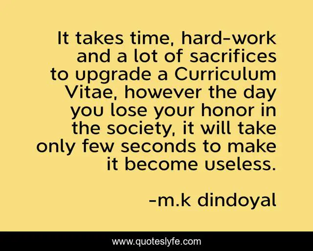 This page presents the quote "It takes time, hard-work and a lot of sacrifices to upgrade a Curriculum Vitae, however the day you lose your honor in the society, it will take only few seconds to make it become useless.". Author of this quote is m.k dindoyal. This quote is about sacrifice, honor, hard-work,.