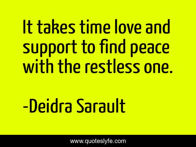 This page presents the quote "It takes time love and support to find peace with the restless one.". Author of this quote is Deidra Sarault. This quote is about peace, mind,.