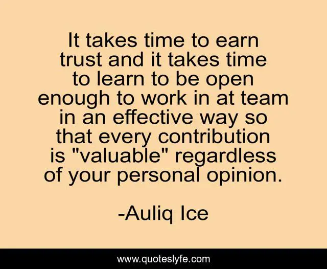 This page presents the quote "It takes time to earn trust and it takes time to learn to be open enough to work in at team in an effective way so that every contribution is "valuable" regardless of your personal opinion.". Author of this quote is Auliq Ice. .