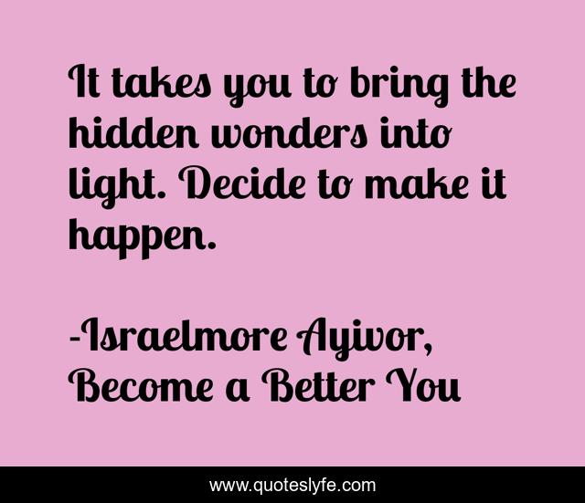 This page presents the quote "It takes you to bring the hidden wonders into light. Decide to make it happen.". Author of this quote is Israelmore Ayivor, Become a Better You. This quote is about make-a-change, motivations, food-for-thought, inspirations, hide, darkness, light, decision, motivational,.