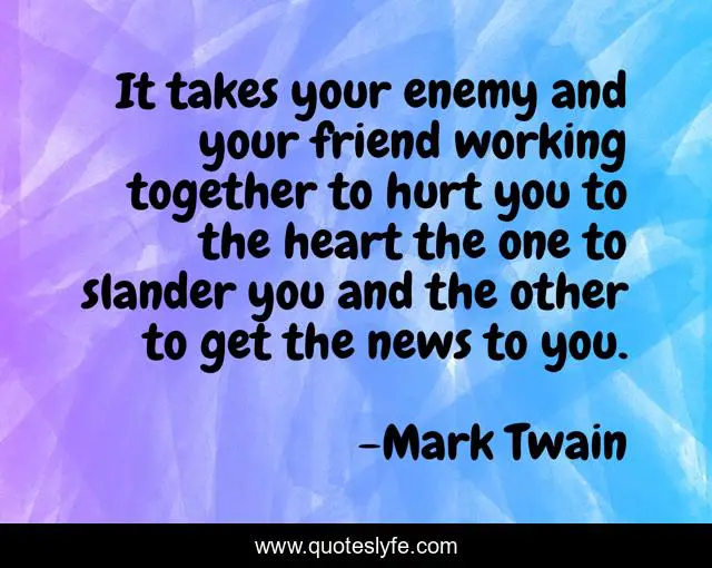 This page presents the quote "It takes your enemy and your friend working together to hurt you to the heart the one to slander you and the other to get the news to you.". Author of this quote is Mark Twain. This quote is about calumny, insults,.