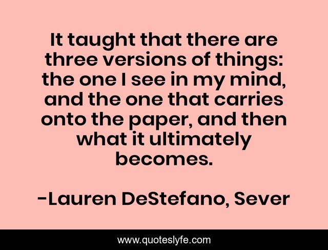 This page presents the quote "It taught that there are three versions of things: the one I see in my mind, and the one that carries onto the paper, and then what it ultimately becomes.". Author of this quote is Lauren DeStefano, Sever. This quote is about linden, things, mind, reality, paper, actuality,.