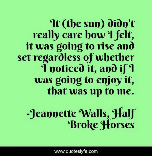 This page presents the quote "It (the sun) didn't really care how I felt, it was going to rise and set regardless of whether I noticed it, and if I was going to enjoy it, that was up to me.". Author of this quote is Jeannette Walls, Half Broke Horses. .