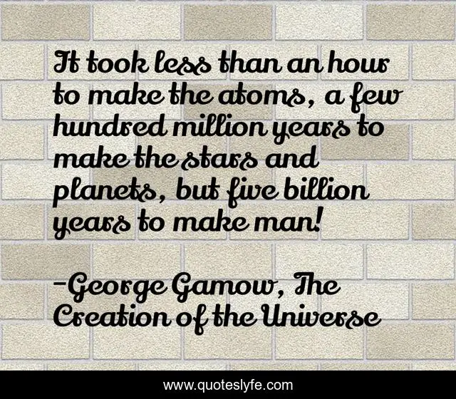 This page presents the quote "It took less than an hour to make the atoms, a few hundred million years to make the stars and planets, but five billion years to make man!". Author of this quote is George Gamow, The Creation of the Universe. This quote is about humor, science, creation, atoms, stars, cosmology, physics,.