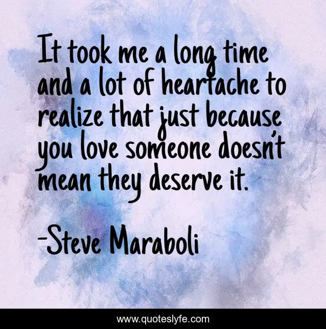 This page presents the quote "It took me a long time and a lot of heartache to realize that just because you love someone doesn’t mean they deserve it.". Author of this quote is Steve Maraboli. This quote is about heartache, love, hurt, breakups, realization, in-love, affection,.