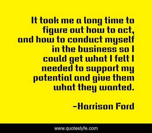 This page presents the quote "It took me a long time to figure out how to act, and how to conduct myself in the business so I could get what I felt I needed to support my potential and give them what they wanted.". Author of this quote is Harrison Ford. This quote is about myself, support, time,.
