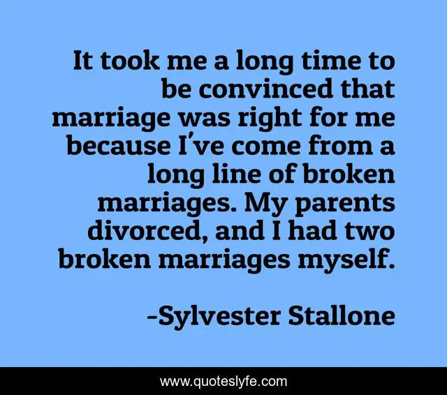 This page presents the quote "It took me a long time to be convinced that marriage was right for me because I've come from a long line of broken marriages. My parents divorced, and I had two broken marriages myself.". Author of this quote is Sylvester Stallone. This quote is about myself, parents, time,.
