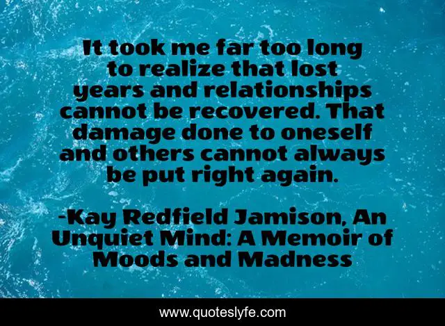 This page presents the quote "It took me far too long to realize that lost years and relationships cannot be recovered. That damage done to oneself and others cannot always be put right again.". Author of this quote is Kay Redfield Jamison, An Unquiet Mind: A Memoir of Moods and Madness. This quote is about manic-depression, mental-health, depression, mental-illness,.