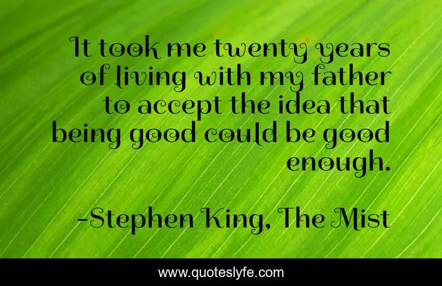 This page presents the quote "It took me twenty years of living with my father to accept the idea that being good could be good enough.". Author of this quote is Stephen King, The Mist. This quote is about stephen-king, good, reassurance, the-mist,.
