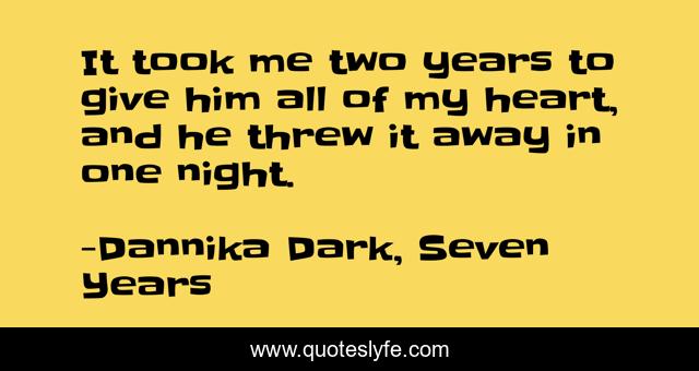 This page presents the quote "It took me two years to give him all of my heart, and he threw it away in one night.". Author of this quote is Dannika Dark, Seven Years. This quote is about heart, mageri, one-night, quote, even-years, romance, shifters, heartbreak, alpha-male,.