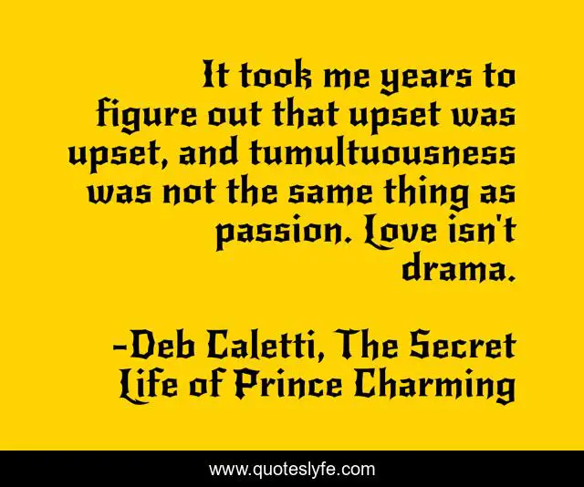 This page presents the quote "It took me years to figure out that upset was upset, and tumultuousness was not the same thing as passion. Love isn't drama.". Author of this quote is Deb Caletti, The Secret Life of Prince Charming. This quote is about drama, love, passion, upset, affection,.