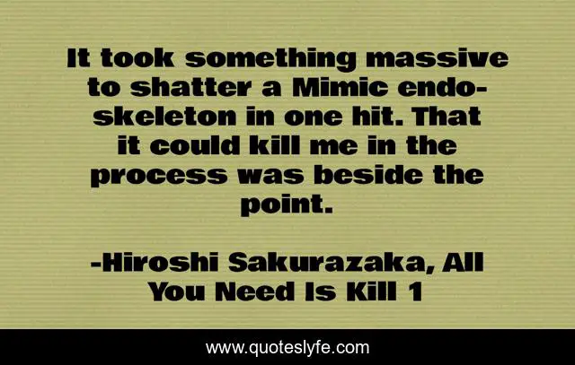 This page presents the quote "It took something massive to shatter a Mimic endo-skeleton in one hit. That it could kill me in the process was beside the point.". Author of this quote is Hiroshi Sakurazaka, All You Need Is Kill 1. This quote is about kill, mimic, shatter, self,.