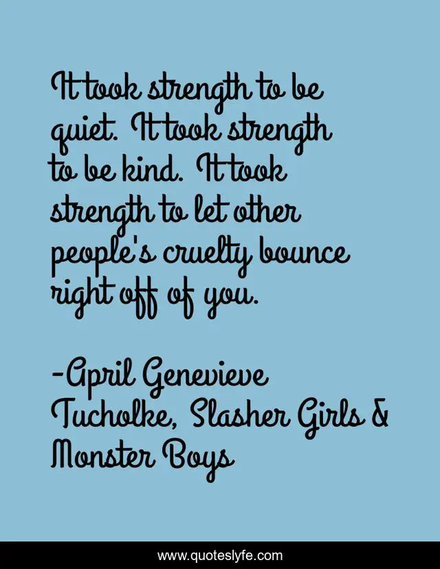 This page presents the quote "It took strength to be quiet. It took strength to be kind. It took strength to let other people's cruelty bounce right off of you.". Author of this quote is April Genevieve Tucholke, Slasher Girls & Monster Boys. This quote is about bullying, strength,.