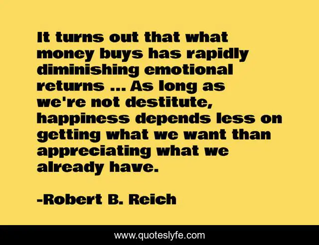 This page presents the quote "It turns out that what money buys has rapidly diminishing emotional returns ... As long as we're not destitute, happiness depends less on getting what we want than appreciating what we already have.". Author of this quote is Robert B. Reich. This quote is about aftershock, happiness,.