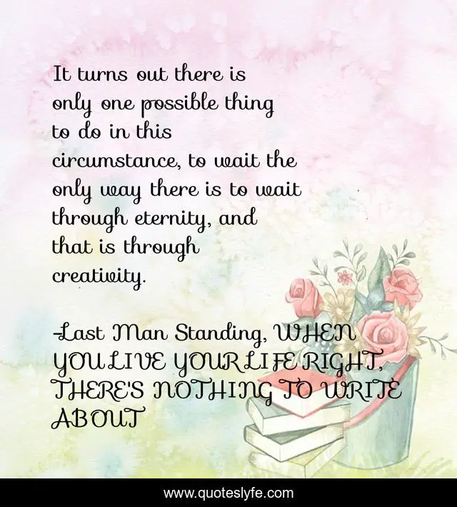 This page presents the quote "It turns out there is only one possible thing to do in this circumstance, to wait the only way there is to wait through eternity, and that is through creativity.". Author of this quote is Last Man Standing, WHEN YOU LIVE YOUR LIFE RIGHT, THERE'S NOTHING TO WRITE ABOUT. This quote is about eternity, creativity, time,.