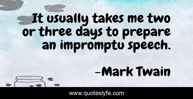 This page presents the quote "It usually takes me two or three days to prepare an impromptu speech.". Author of this quote is Mark Twain. This quote is about preparedness, humor,.