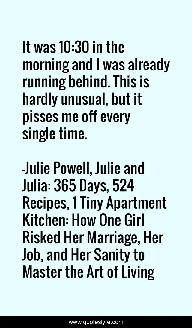 "Julie Powell, Julie and Julia: 365 Days, 524 Recipes, 1 Tiny Apartment Kitchen: How One Girl Risked Her Marriage, Her Job, and Her Sanity to Master the Art of Living Quotes." Quoteslyfe.com, 2025. Sat. 06 Dec. 2025. <https://www.quoteslyfe.com/quote/It-was-10-30-in-the-morning-217197>.