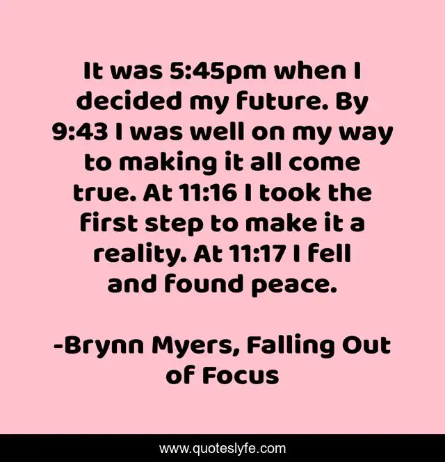 This page presents the quote "It was 5:45pm when I decided my future. By 9:43 I was well on my way to making it all come true. At 11:16 I took the first step to make it a reality. At 11:17 I fell and found peace.". Author of this quote is Brynn Myers, Falling Out of Focus. This quote is about good-vs-evil, fantasy, fae, romance, self-discovery,.