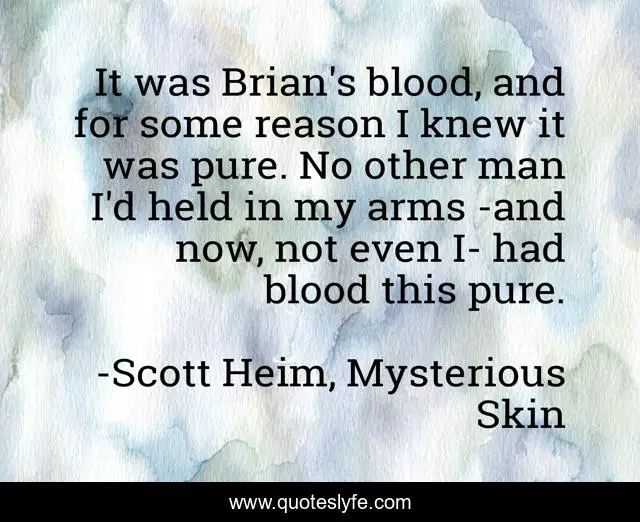 This page presents the quote "It was Brian's blood, and for some reason I knew it was pure. No other man I'd held in my arms -and now, not even I- had blood this pure.". Author of this quote is Scott Heim, Mysterious Skin. This quote is about blood, pureness,.