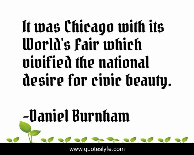 This page presents the quote "It was Chicago with its World's Fair which vivified the national desire for civic beauty.". Author of this quote is Daniel Burnham. This quote is about desire, world, chicago,.